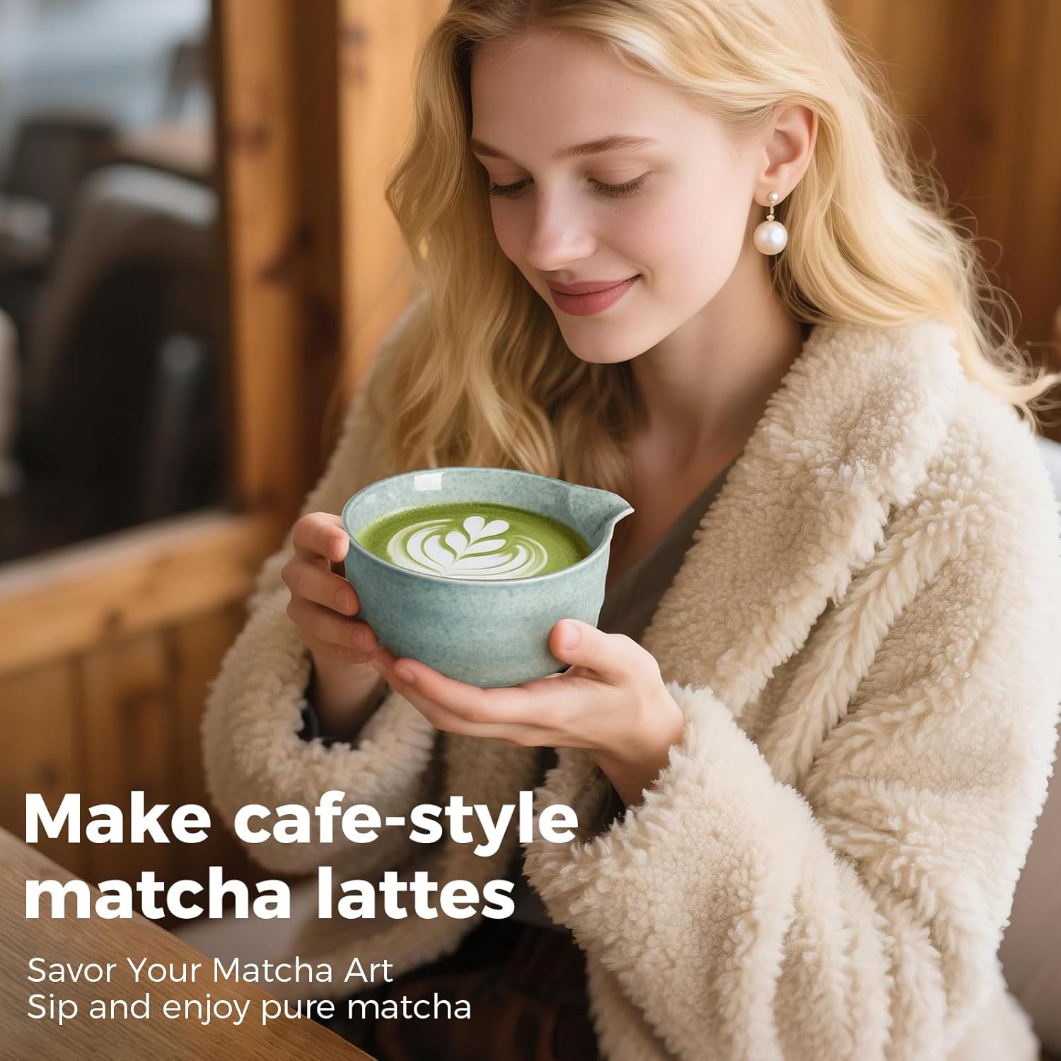 Matcha Whisk Set - Bamboo Whisk and Holder, Bowl with Spout (17 oz), Matcha Sifter and Scoop, 5 Pcs Cute Matcha Kit Set Gift for Matcha Lovers (Bluish Green)