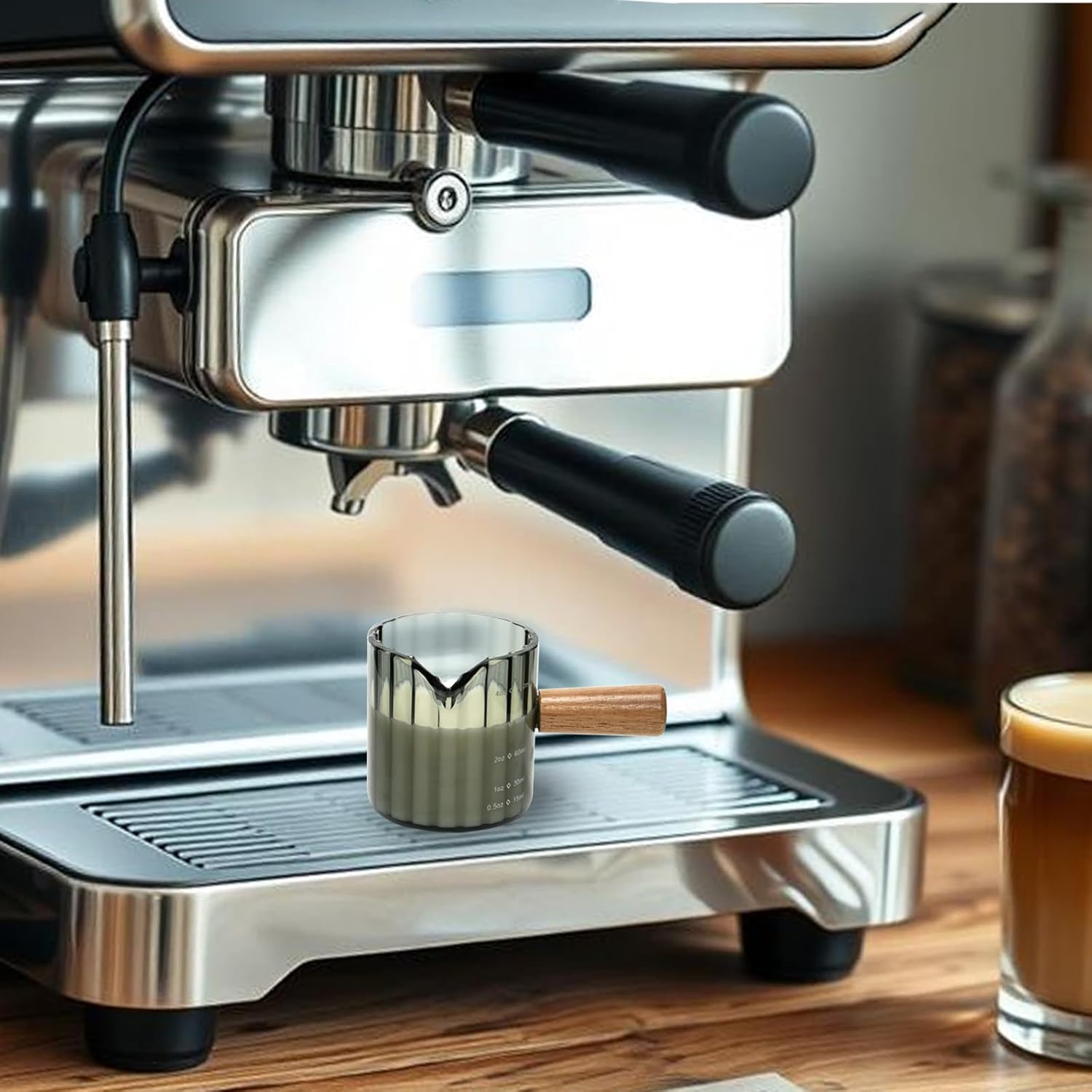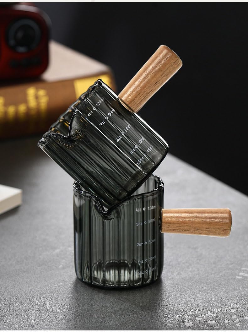 - Elegant Design: The ribbed glass design give this espresso measuring cup an elegant look/feel, wooden handle for a more comfortable grip, making it a long-lasting addition to your kitchen home and restaurant .