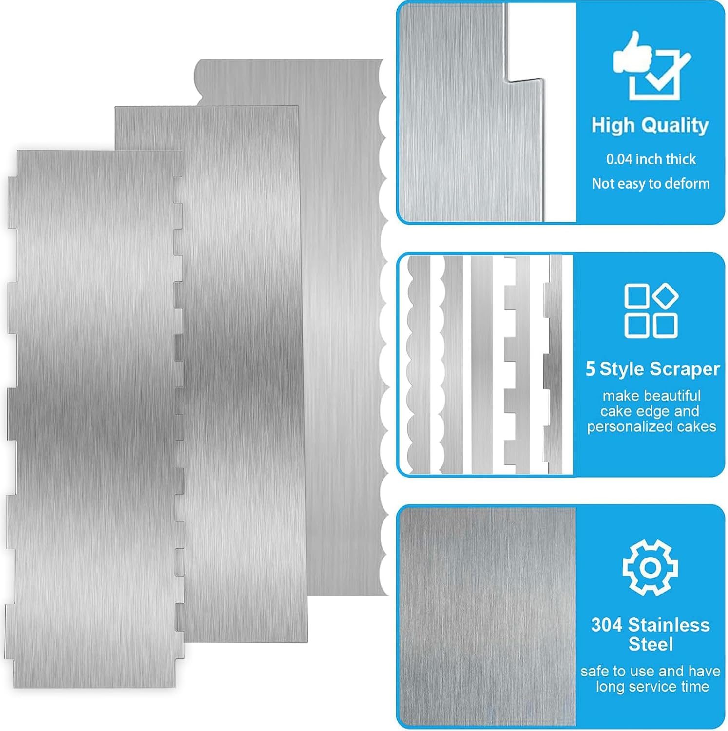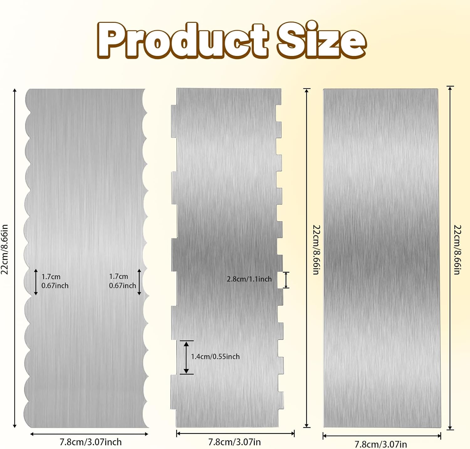 - What’s Included Each package includes 3 stainless steel cake scraper with 2 patterns (smooth edge and striped edge). Measuring 8.7 inches, it’s the perfect size for handling cakes of all shapes and sizes. Whether you’re a beginner or a pro, this tool will help you create beautiful, professional-quality cakes every time