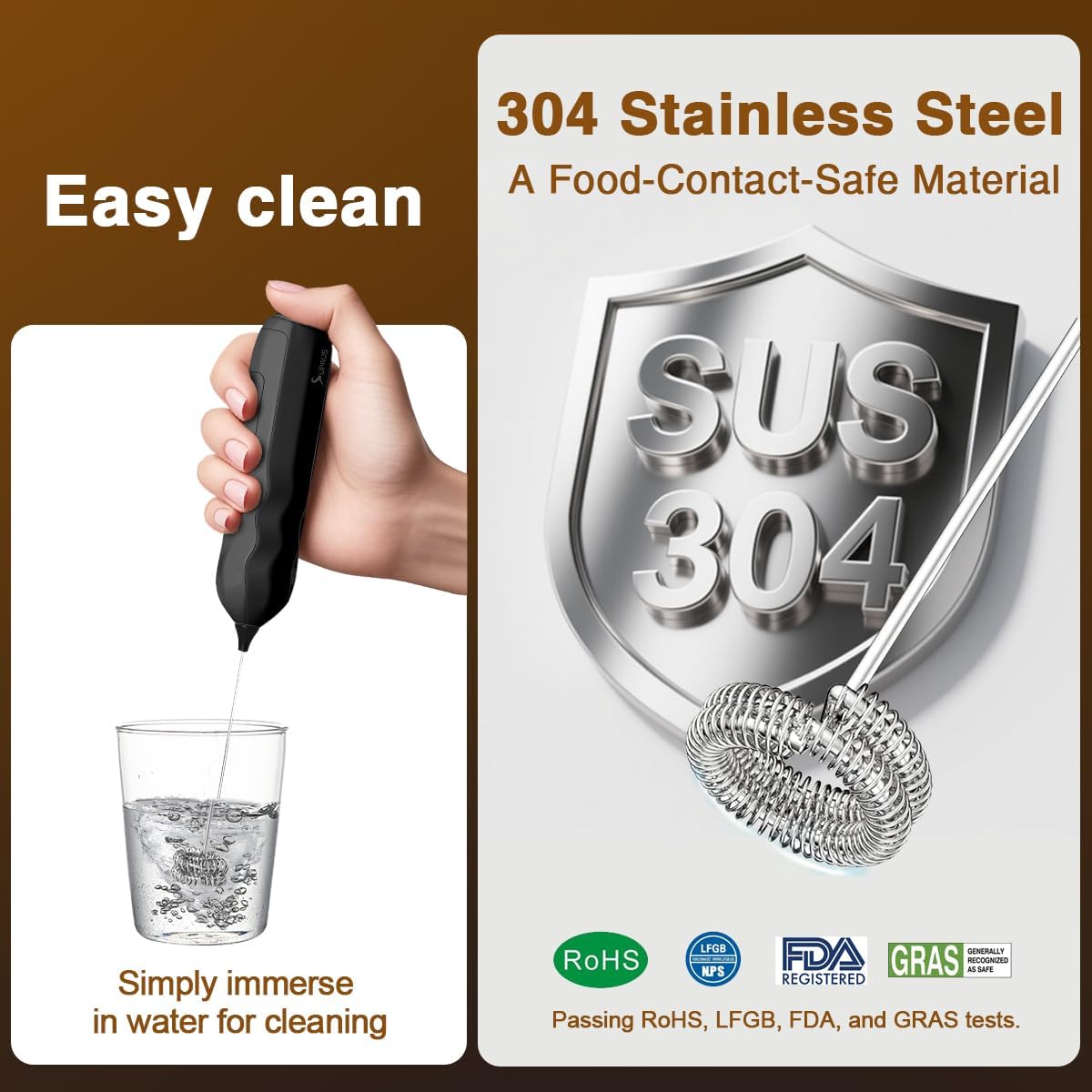 - Barista-Style Froth in 15 Seconds Whip up creamy, velvety foam for lattes, cappuccinos and matcha drinks with our professional handheld milk frother. The dual stainless steel whisks create rich, café-quality froth faster than single-whisk models. Ideal for coffee lovers who enjoy specialty drinks at home without expensive equipment.