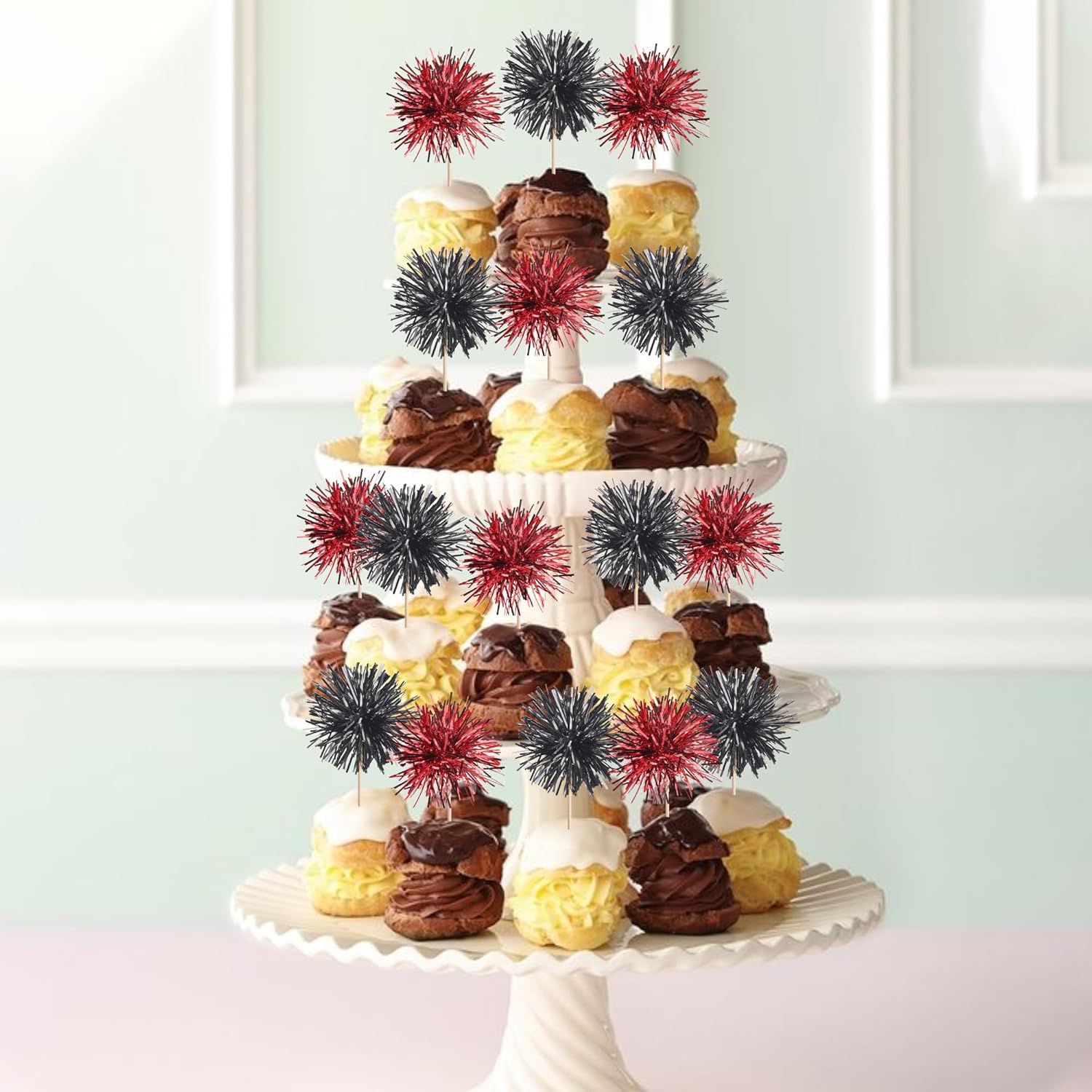 40 PCS Foil Firework Cupcake Toppers Sparkle Tinsel Cupcake Picks Fireworks Birthday Party Decorations Cocktail Fruit Toothpick for Birthday Wedding Graduation Party Decorations Supplies Black Red