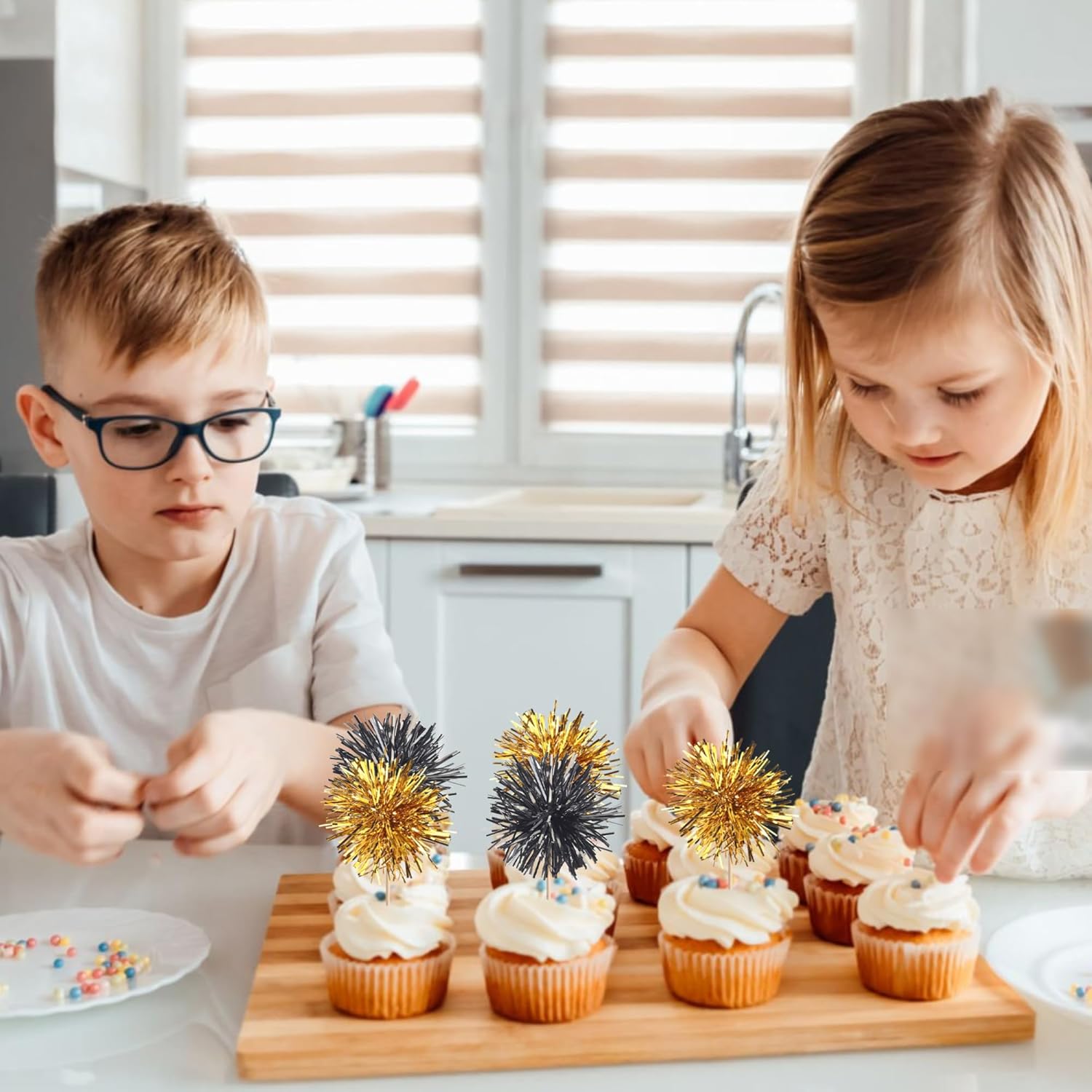 40 PCS Foil Firework Cupcake Toppers Sparkle Tinsel Cupcake Picks Fireworks Birthday Party Decorations Cocktail Fruit Toothpick for Birthday Wedding Graduation Party Decorations Supplies Black Gold