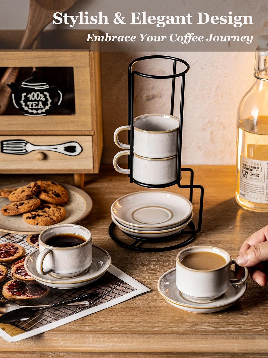- STACKABLE & SAVE SPACE: Maximize counter space! These cappuccino cups stack inside of each other in the included metal rack, they are a breeze to store, making them ideal for small kitchens, coffee bars, or dorm rooms. Store vertically, save space!