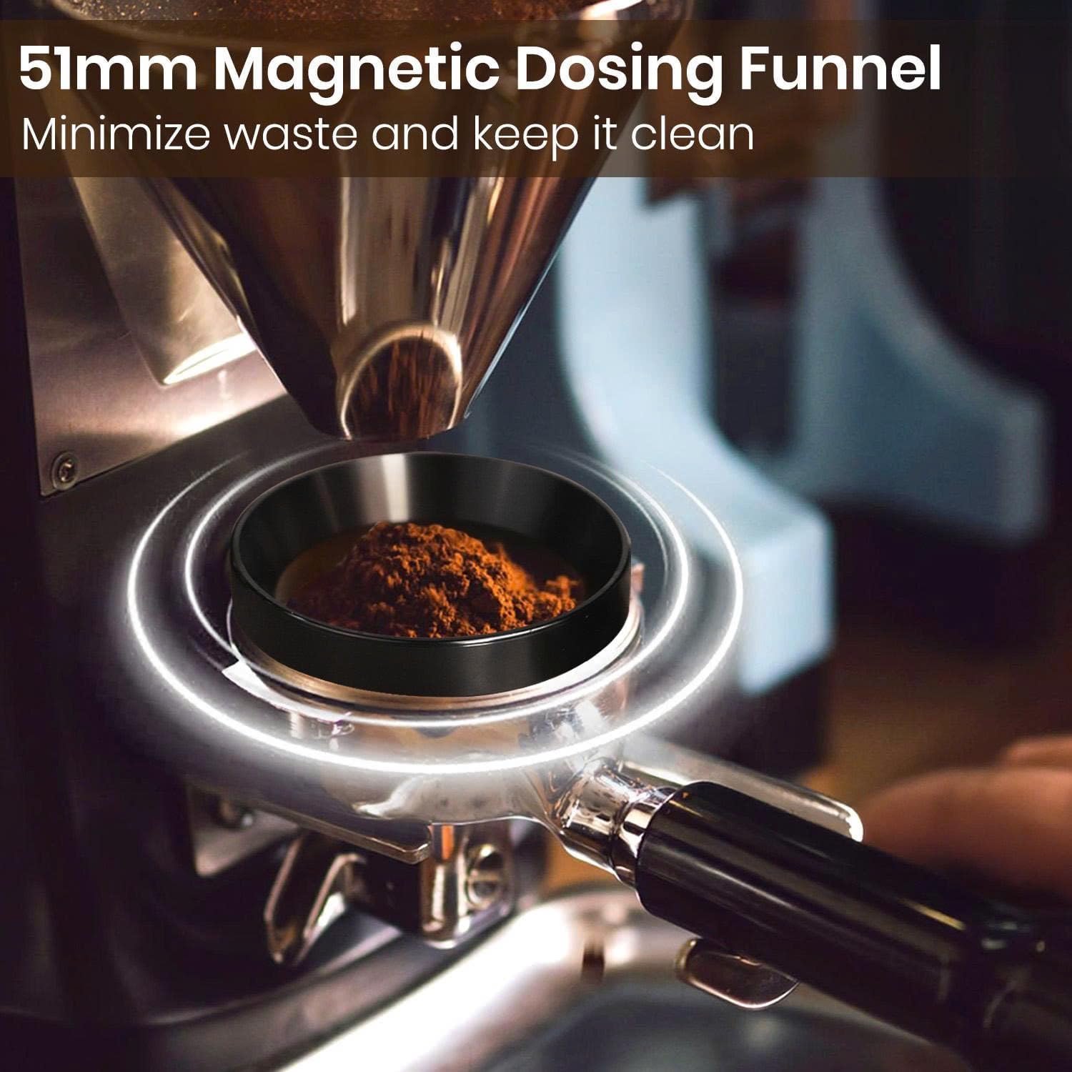 - Magnetic Dosing Funnel: A must-have in any espresso kit, this dosing funnel is designed for espresso machines with a strong magnetic base for secure attachment and easy installation. It stays firmly in place during use, minimizes coffee powder splash, and keeps your workspace clean. Paired with your espresso distribution tool and other espresso tools, it ensures accurate dosing and a smoother, mess-free workflow—delivering a more enjoyable coffee-making experience.