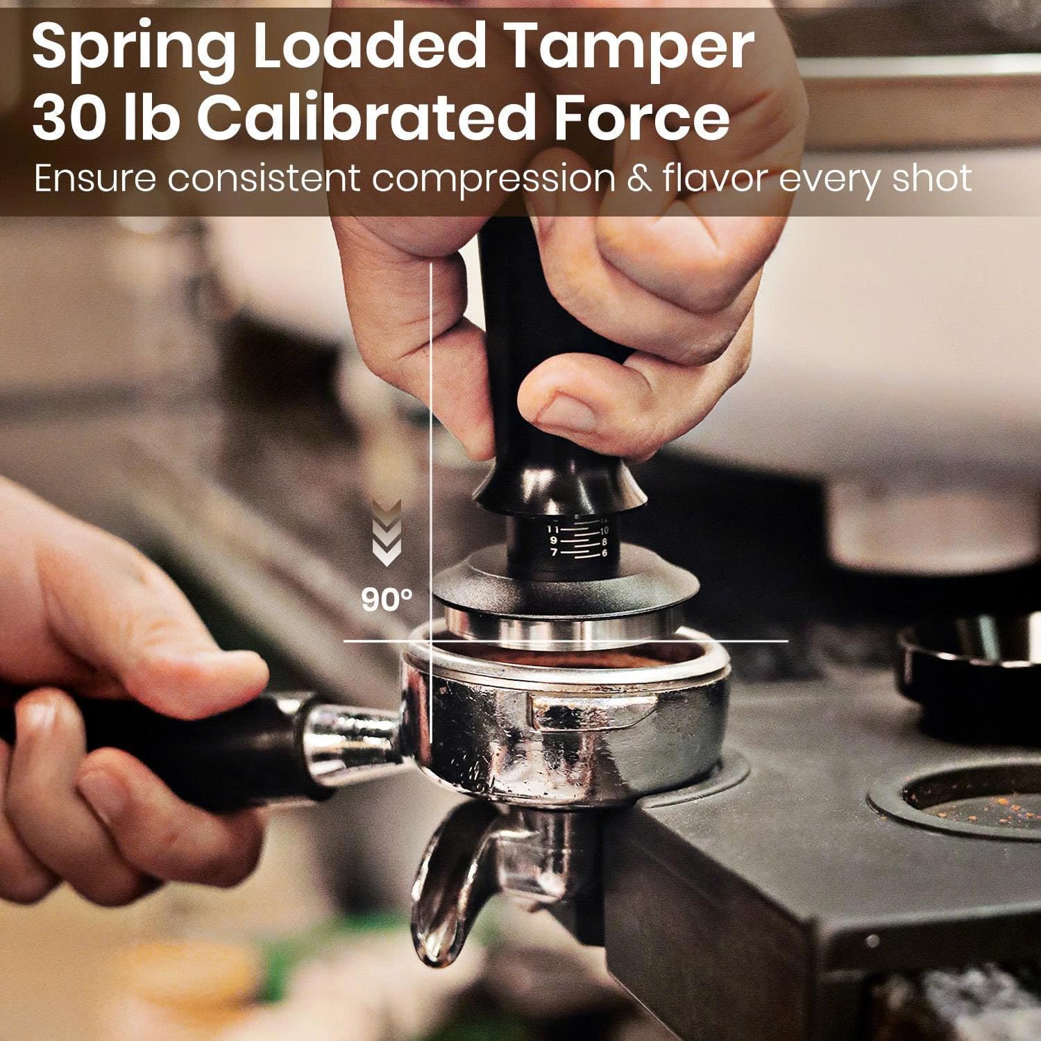 - Espresso Tamper Kit: Part of a complete espresso tool kit, this calibrated spring-loaded tamper delivers 30 lbs of consistent pressure for precise and repeatable tamping. Designed with dual constant-force springs and a built-in leveling plug, it ensures a flat, even coffee puck every time—boosting extraction and flavor. Ideal for those seeking high-quality espresso accessories 51mm and reliable coffee espresso accessories, this tool is barista-tested and trusted for professional results.