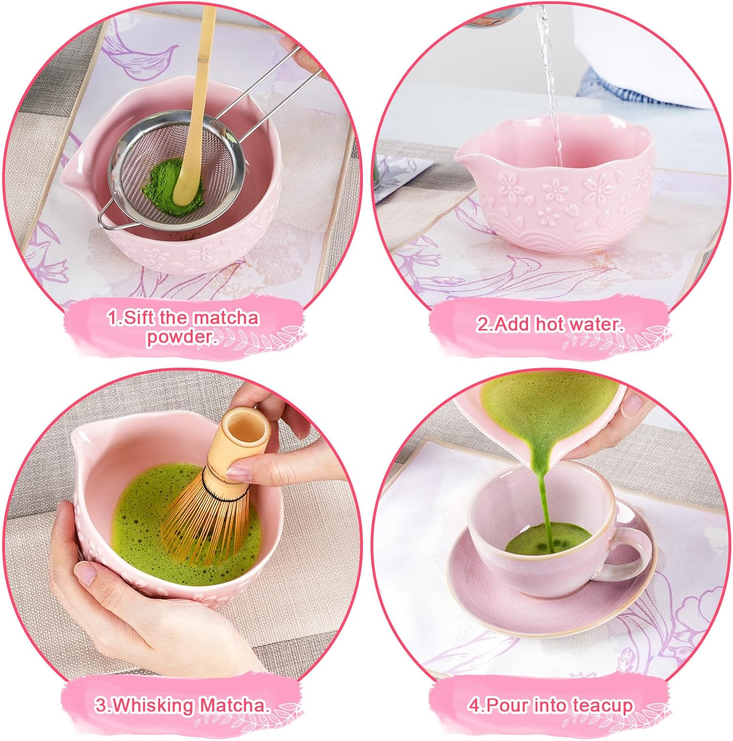 Matcha Whisk Set, Matcha Set 7 Pieces - Ceramic Matcha Bowl with Spout, Bamboo Chasen Whisk & Holder, Scoop, Sifter, Tea Towel - Complete Kit for Matcha Tea Ceremony, Latte, Ideal Gift(Pink)