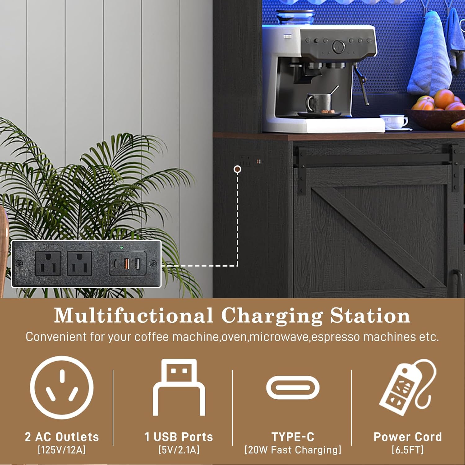 - 【Convenient Charging Sockets】 The Coffee bar cabinets comes with a built-in power outlet, which features 2 AC plugs and 2 USB ports,1 type-c, powering up your essentials like ice-maker, coffee maker, wine fridge or microwave is a breeze. Elevate your space effortlessly – sip, relax, and enjoy!