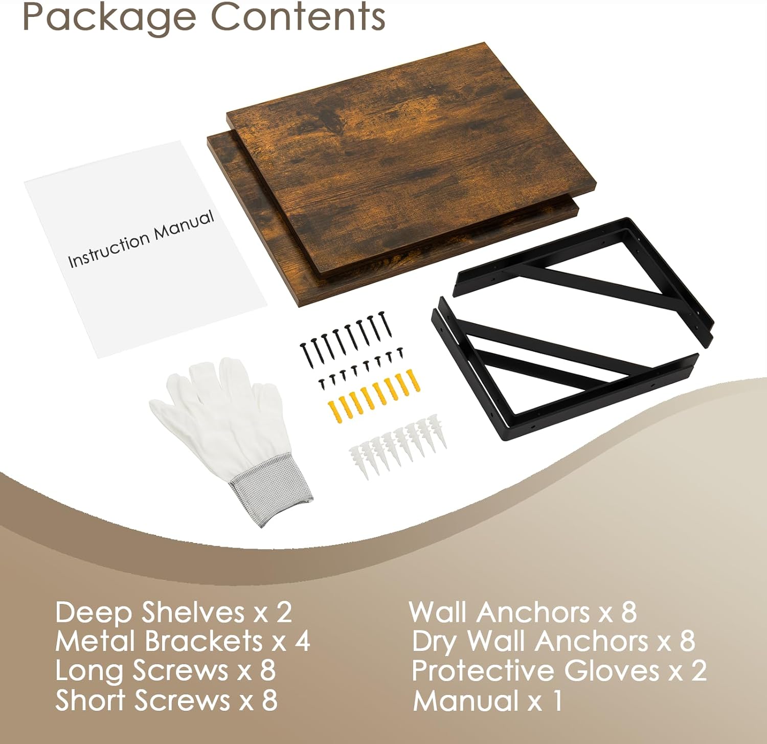 DINZI LVJ Deep Floating Shelves, 16"W x 12"D Wall Shelves Set of 2, Wide Display Shelf Wall Mounted with Brackets, Easy-to-Install Floating Bookshelf for Living Room, Bathroom, Bedroom, Rustic Brown