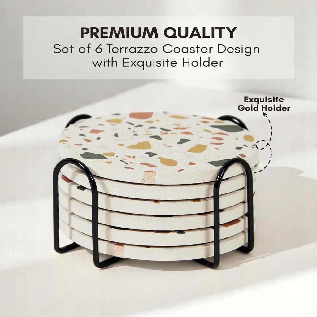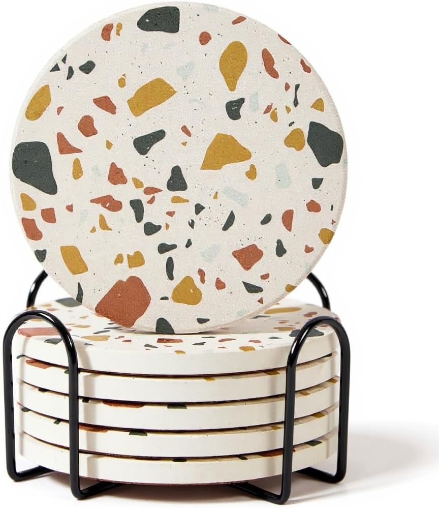 - Modern Terrazzo Style with Holder - Each drink coasters set of 6 includes a black metal coaster holder for neat storage when not in use. The terrazzo finish blends seamlessly with farmhouse, modern, or minimalist themes, making it suitable for desks, dining tables, or living room coffee table decor.