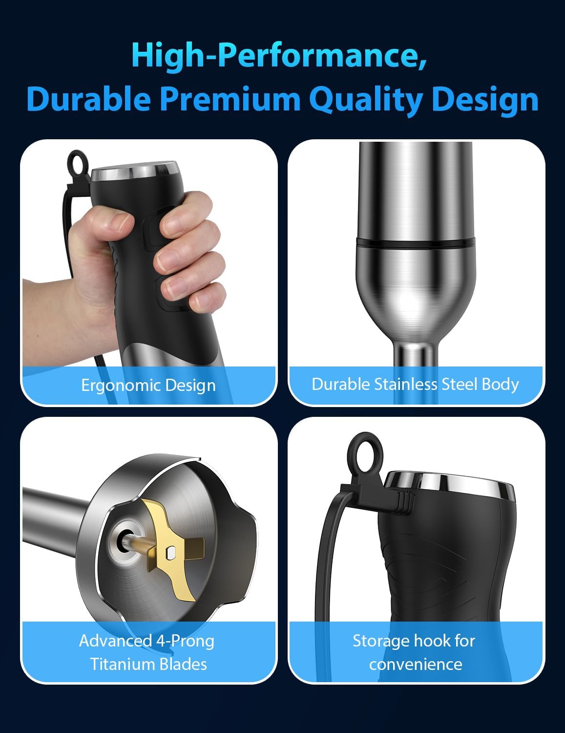 - 【4-Blade Titanium Head】Our immersion blender boasts a 4-blade titanium head for exceptional performance. Unlike standard 2-blade designs, it blends more efficiently and increases the blades' lifespan. This innovative design makes it a reliable choice for all your culinary needs.