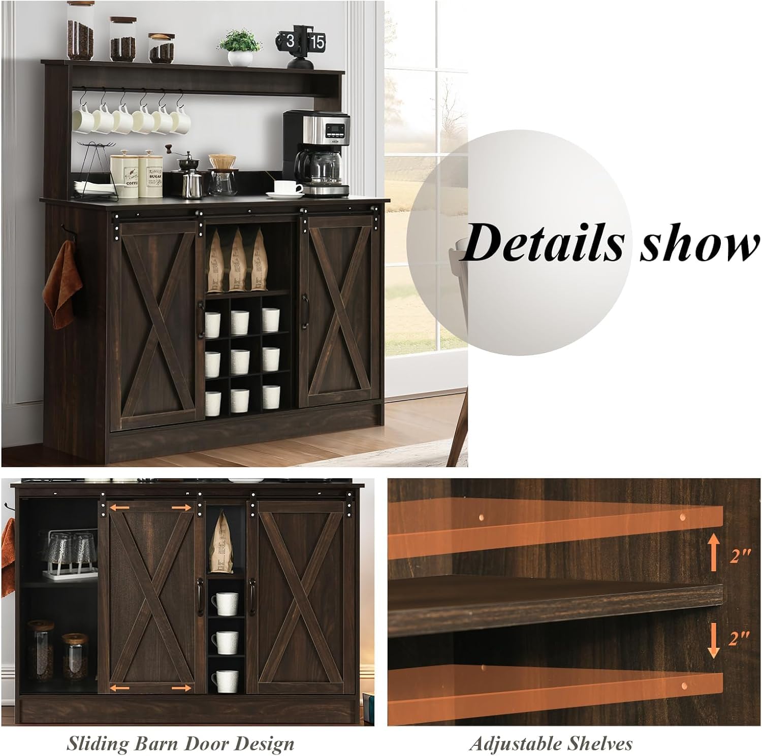 - FARMHOUSE WITH CLASSIC COFFEE BAR: The coffee bar with X design sliding barn door is easy to pull left and right, its design is classic and uncluttered. The coffee bar cabinets feature a yellow wood-grain color scheme for a farmhouse modern look