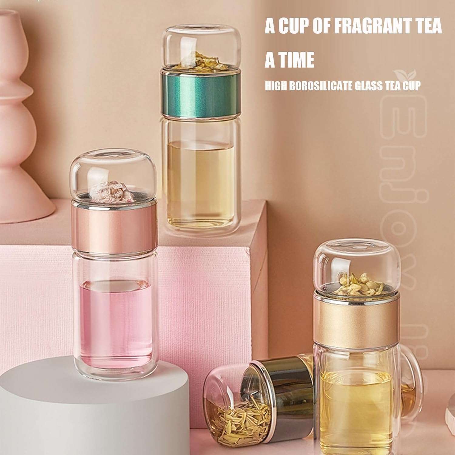 - 3-in-1 Versatility: This tea infuser bottle as a tea infuser, a fruit infuser, or remove the filter to turn it into your everyday water bottle—meeting multiple drink needs in one stylish design; Enjoy a Burn-Free Experience with the Double-Walled Glass Insulation That Keeps the Exterior Cool to the Touch.