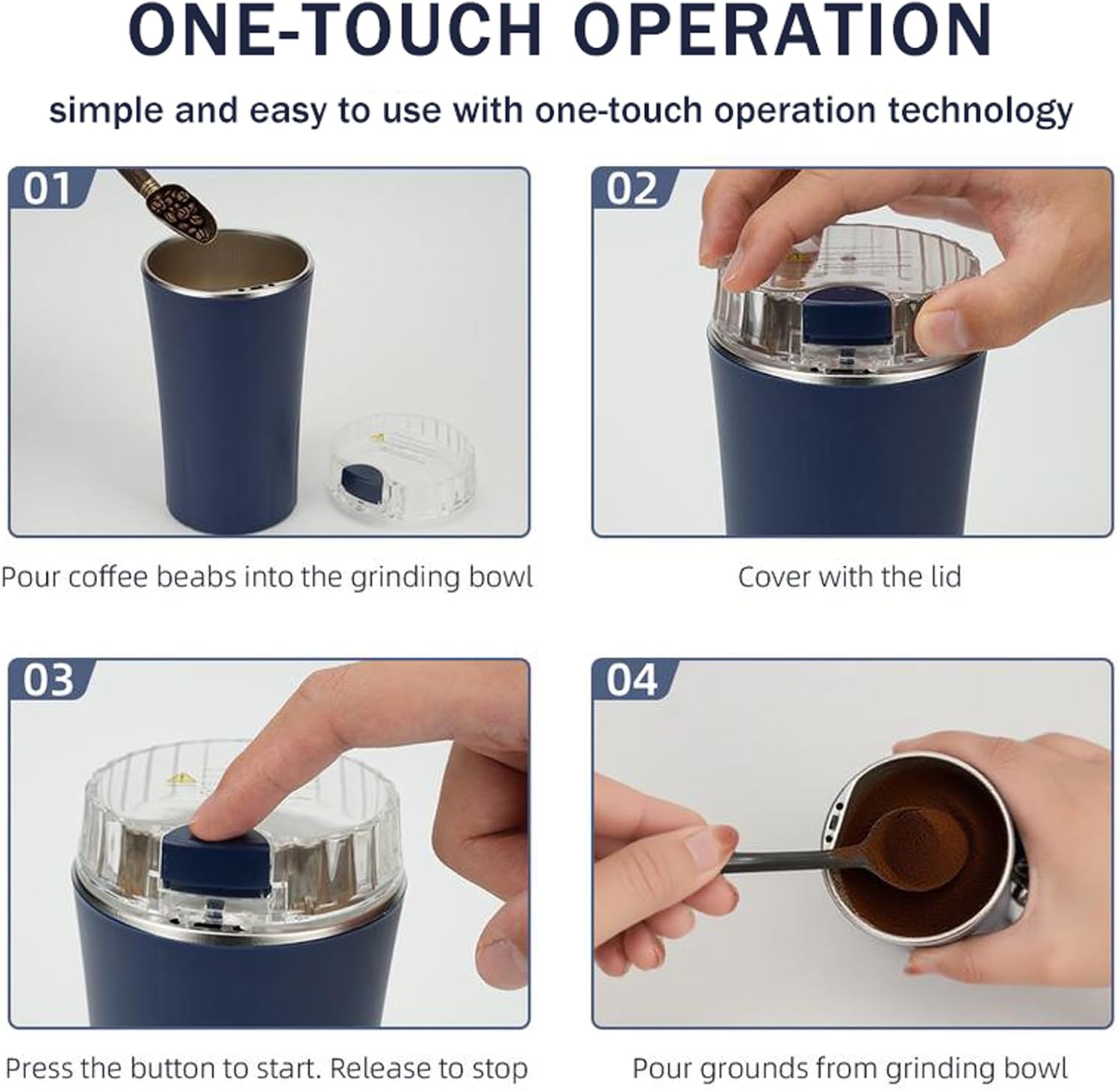 - EASY OPERATION: Simple one-touch push-button control makes grinding quick and effortless, ideal for both beginners and experienced users.Pour in up to 60g beans, put the lid on, press the control button, the grinding starts. Release the button, the grinding stops. Easy one-button operation of the grinder achieves you to get the desired coffee powders.