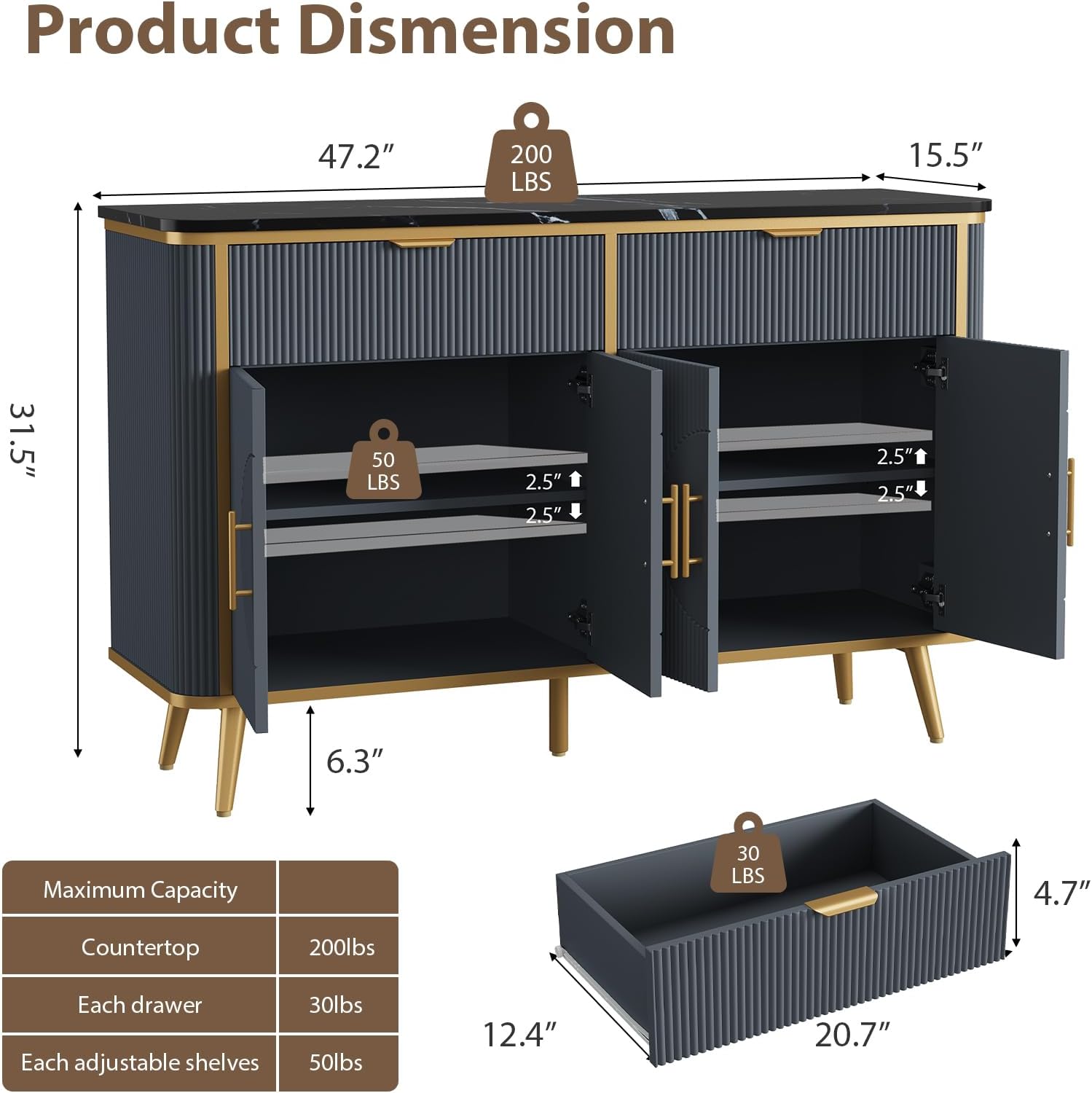 - Modern Fluted Striped Design—This chic sideboard features a unique fluted panel and curved contour design, enhancing a stereo feeling with striking geometric lines. Its exquisite designed polished and frosted handles are matched with the marble-textured finish countertop, which combines modern aesthetics with natural style, adding a touch of fashion and luxury to the room.