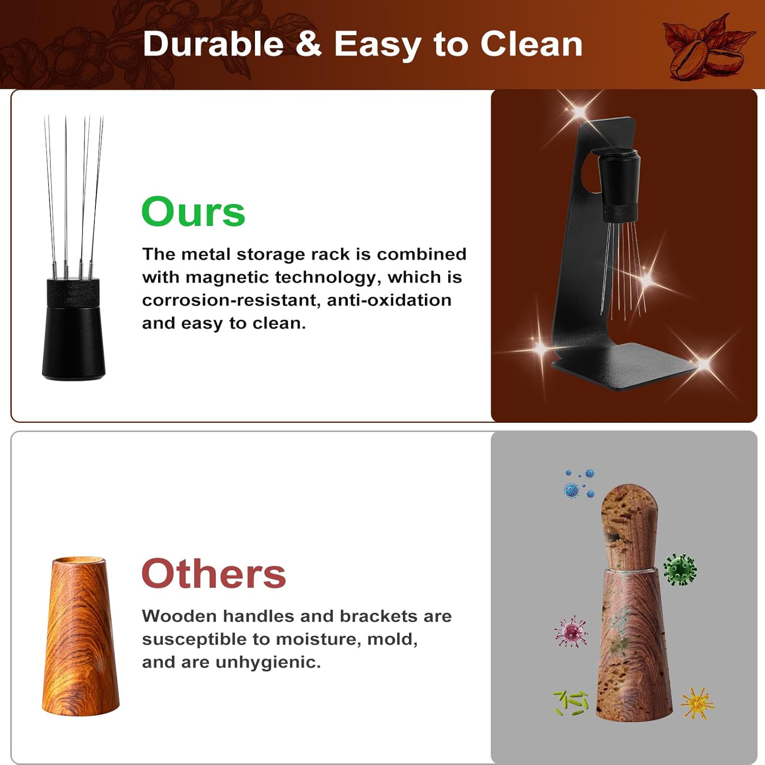 - About Coffee Distribution Stirrer: Espresso WDT Tool-Coffee Distribution Stirrer has up to 8 needles. It is designed to break up clumps, create a uniform coffee bed, and ensure a consistent density in your basket. Only 0.25mm needle promotes better extraction, resulting in a smoother espresso. The agitator is fixed on the design of the iron frame by magnetic suction, which can ensure the perfect preservation and ventilation of the mixing needle, and is not easy to deformation