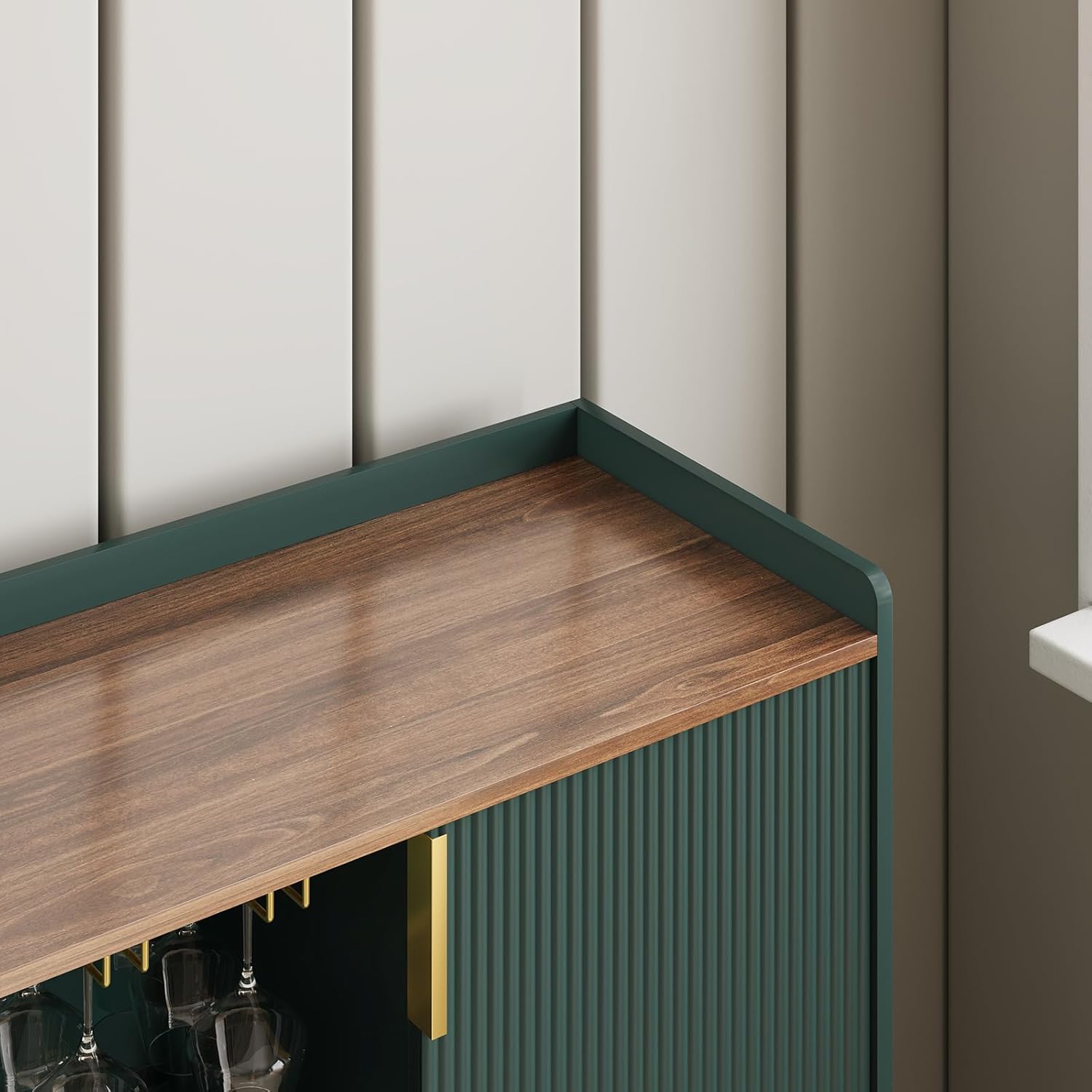 - 【Timeless Design, Contemporary Flair】 The coffee bar cabinet features gently fluted panels and softly curved silhouettes that blend mid-modern warmth with Deco-inspired elegance. Smooth curved edges contribute to a sleek silhouette while enhancing safety—especially in households with children. Warm fluted grain, gold handles, and tapered legs create a look that’s upscale and inviting.