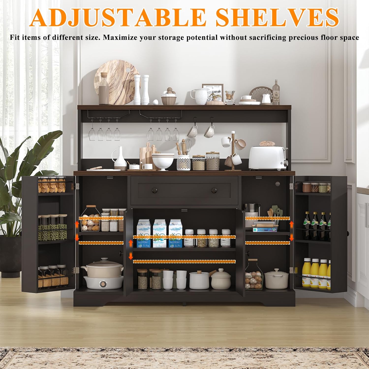 - 【Large Divided Storage】Say goodbye to clutter. The spacious countertop can accommodate coffee makers or microwave ovens. The doors withThe drawers of the coffee bar cabinet make your essentials close to hand. Bottom cabinet can easily store dishes and a side door open to reveal three racks for drinks, snacks or seasoning.