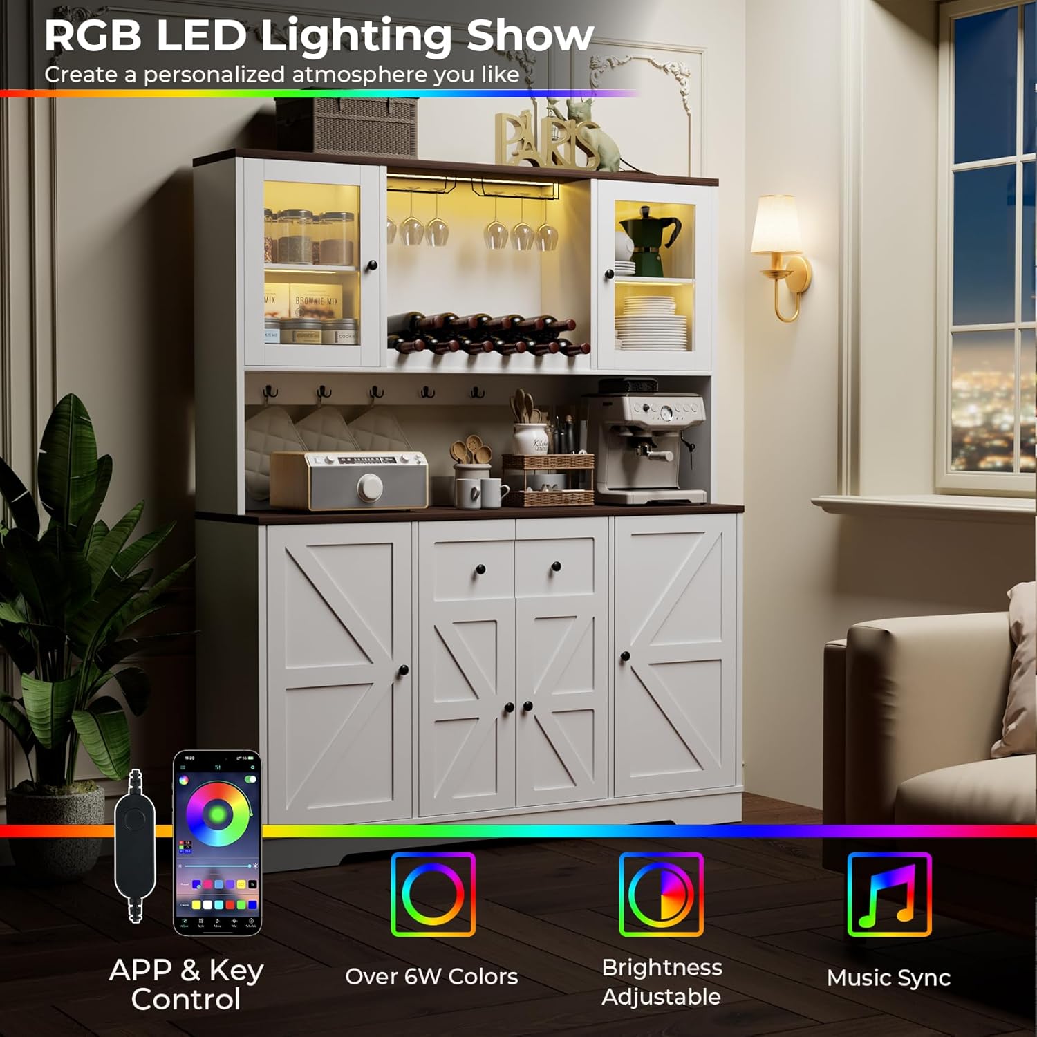 - 【Charging Station & RGB LED】There are 2 AC outlets and 2 USB on the top, and a 6.5-foot power cord, to charge your devices and keep them within reach.This kitchen pantry cabinet is equipped with a smart RGB LED light strip, which creates a healing space for you, so that you can enjoy a pleasant mood while preparing afternoon tea or food.