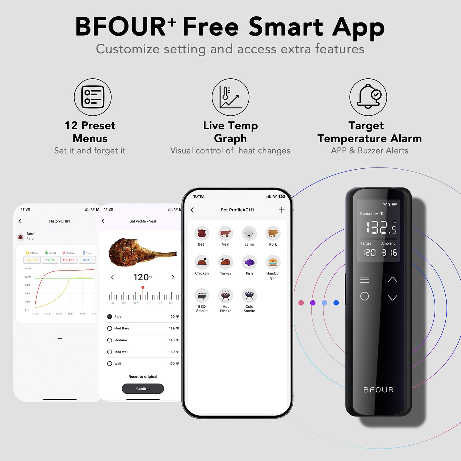 BFOUR WiFi Smart Wireless Meat Thermometer with Standalone Display Base, Bluetooth Food Meat Thermometer with App Control, Internal Ambient Sensor Probes for Cooking, BBQ, Oven, Grill, Smoker